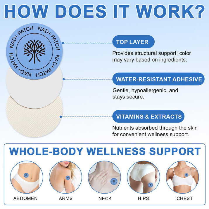 Experience youthful vitality with effortless transdermal patches that deliver NAD+, promoting cellular health and combating aging. A simple addition to your wellness routine for a rejuvenated you.